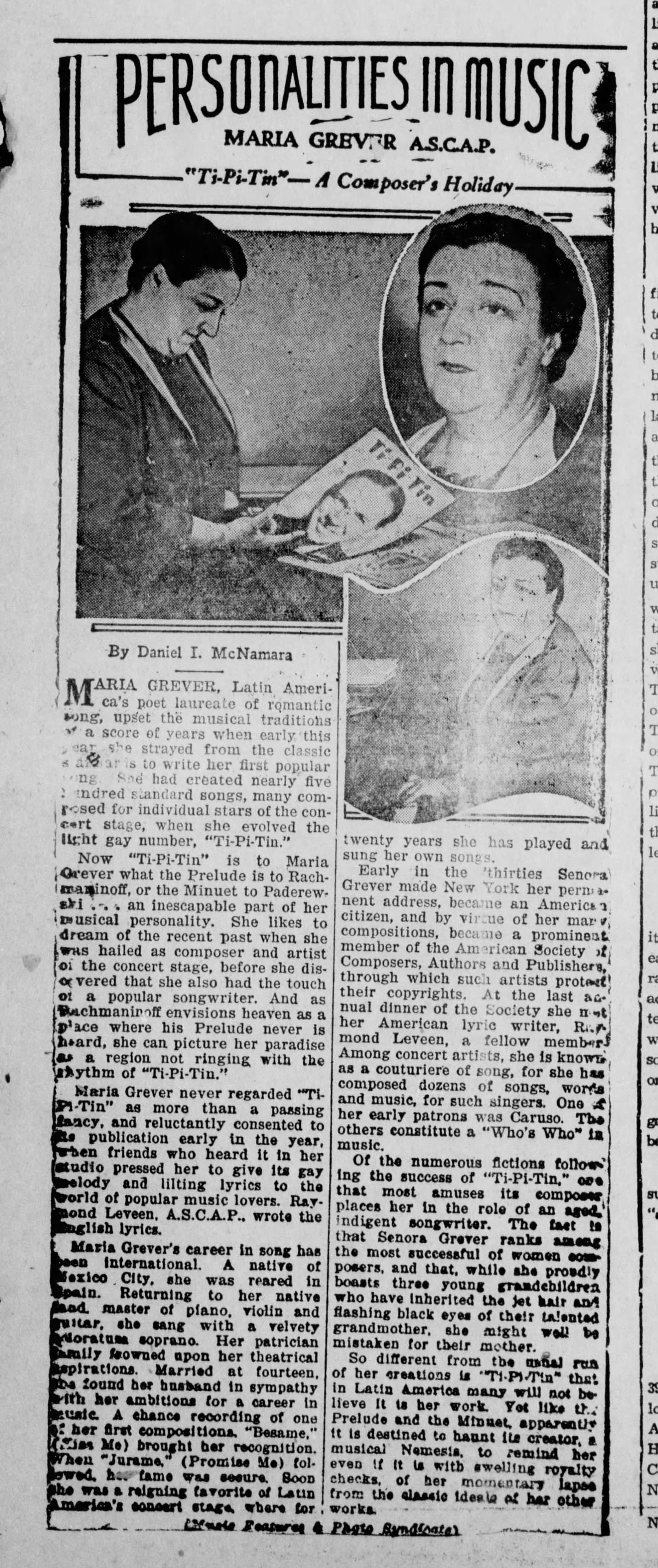 When publishers didn’t like her song Tipitipitin (Ti-Pi-Tin), she started her own company to publish it (Portilla Music Corporation which later would become Grever International S.A.) And the song became a HUGE success when The Andrews Sisters recorded it. (Benny Goodman, Guy Lombardo, Jackie Gleason would go on to do the same themselves.) The story behind how she wrote this song is literally nuts.