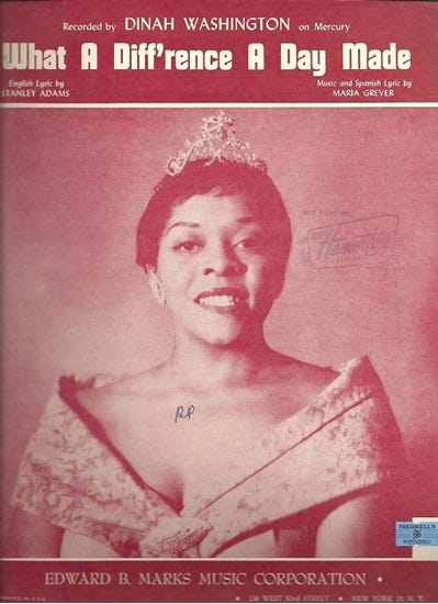 In fact, the English version of Maria’s song “What a Diff'rence a Day Made” won Dinah Washington the Grammy Award for Best Rhythm and Blues Performance in 1959, was inducted into the Grammy Hall of Fame in 1998, AND also earned Washington her first top ten pop hit, reaching number 8 on the Billboard Hot 100. I’ve had Diana Ross’ version on repeat for weeks.